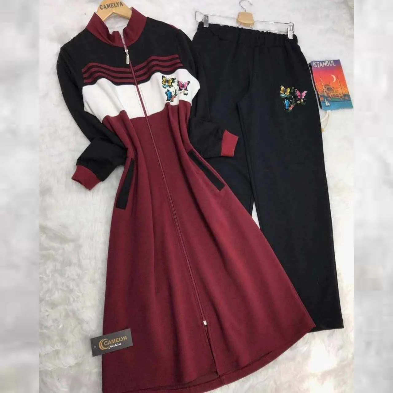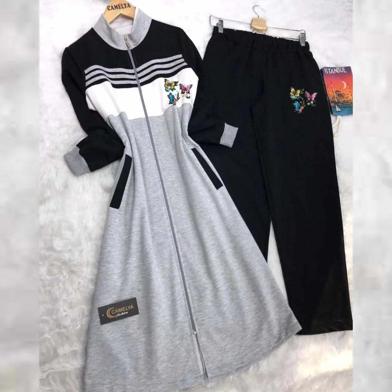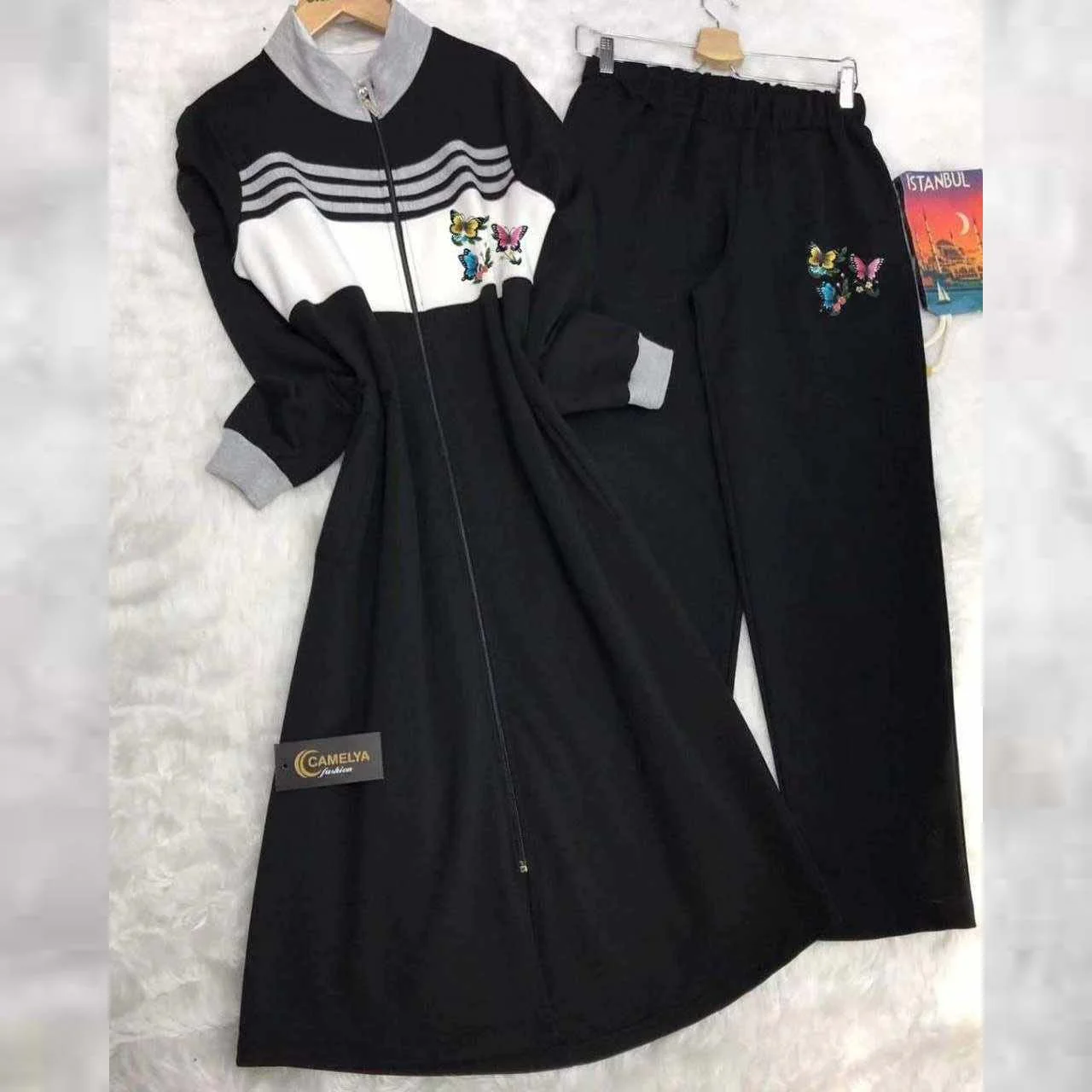 Be the first to review “Butterfly Printed Stripe Style Patch-Work Long 2-Pcs Winter Tracksuit.”
